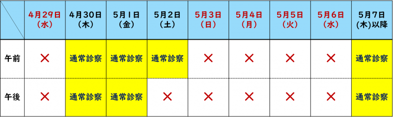 ゴールデンウィーク期間中の外来診察日は、下記のとおりです。