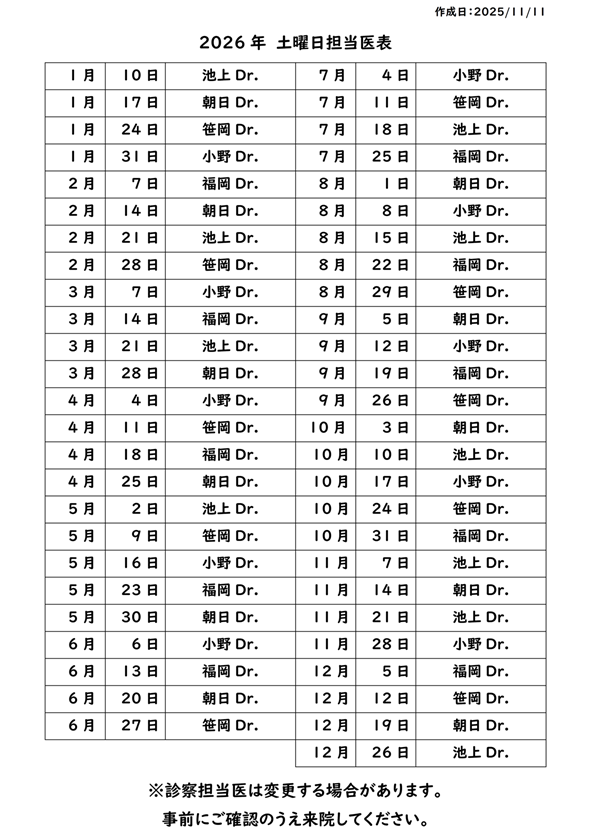 2026年 土曜日担当医表(2025. 11. 11更新)