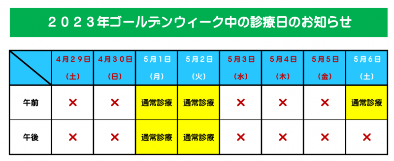 ゴールデンウィーク期間中の外来診察日は、下記のとおりです。