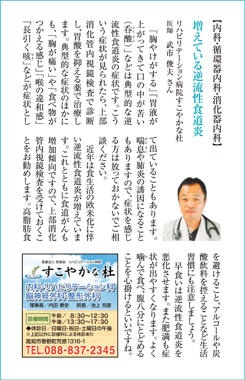 | 平成28年年10月18日 | 武市 俊夫 医師 | 増えている逆流性食道炎 |