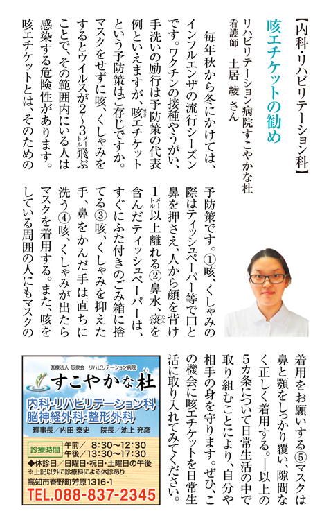 | 平成28年年11月22日 | 土居 綾 看護師 | 咳エチケットの勧め |